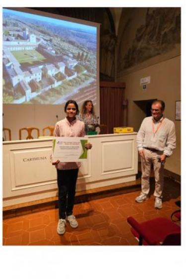 Congratulations to Dhanasri Jayamoorthi! Dhanasri, from Salem, India, a postdoctoral fellow in Professor Paola Cescutti's research group, received the award for best poster presentation at the Scuola Chimica dei Carboidrati conference held in Pontignano (Siena) last June. The poster's title was: Characterization of a bacteriophage endoglycosidase against Klebsiella pneumoniae as a tool for novel antimicrobial strategies.