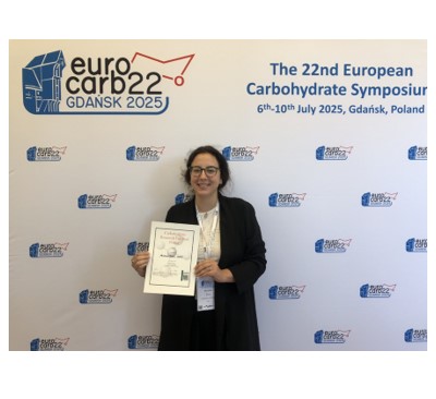 Congratulations to Michela Zaro! Michela, a post-doctoral fellow in Professor Paola Cescutti's research group, received the "Carbohydrate Research" award for best poster at the Eurocarb22 international conference held in Gdansk from July 6 to 10. The poster's title was: "Exploiting bacteriophage endoglycosidase against the capsular polysaccharide of K. pneumoniae as a tool for novel antimicrobial strategies."